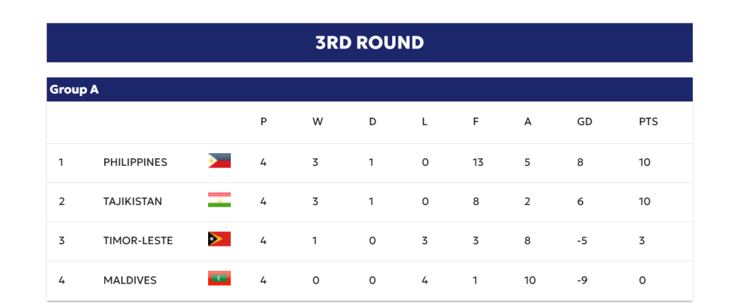 With the result, the Philippines climbed to the top of Group A with 10 points and a +8 goal difference, edging Tajikistan (10 points, +6 GD), which defeated Maldives 3–0 earlier in the day. Timor-Leste slipped to third with three points, while the Maldives remained at the bottom with none.