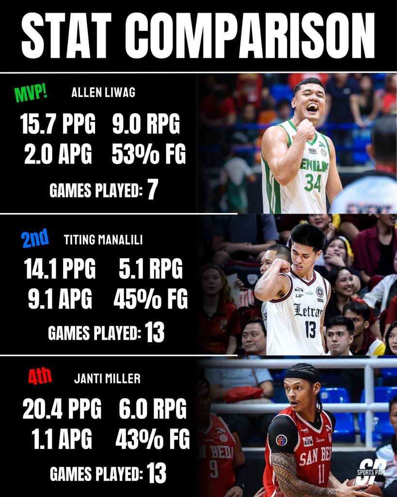 But during the regular season, in which a player could play a maximum number of 14 games and is the only part of the season judged in winning individual awards, the famous sports personality Sports Papi gave the numbers for Manalili, Liwag and Janti.