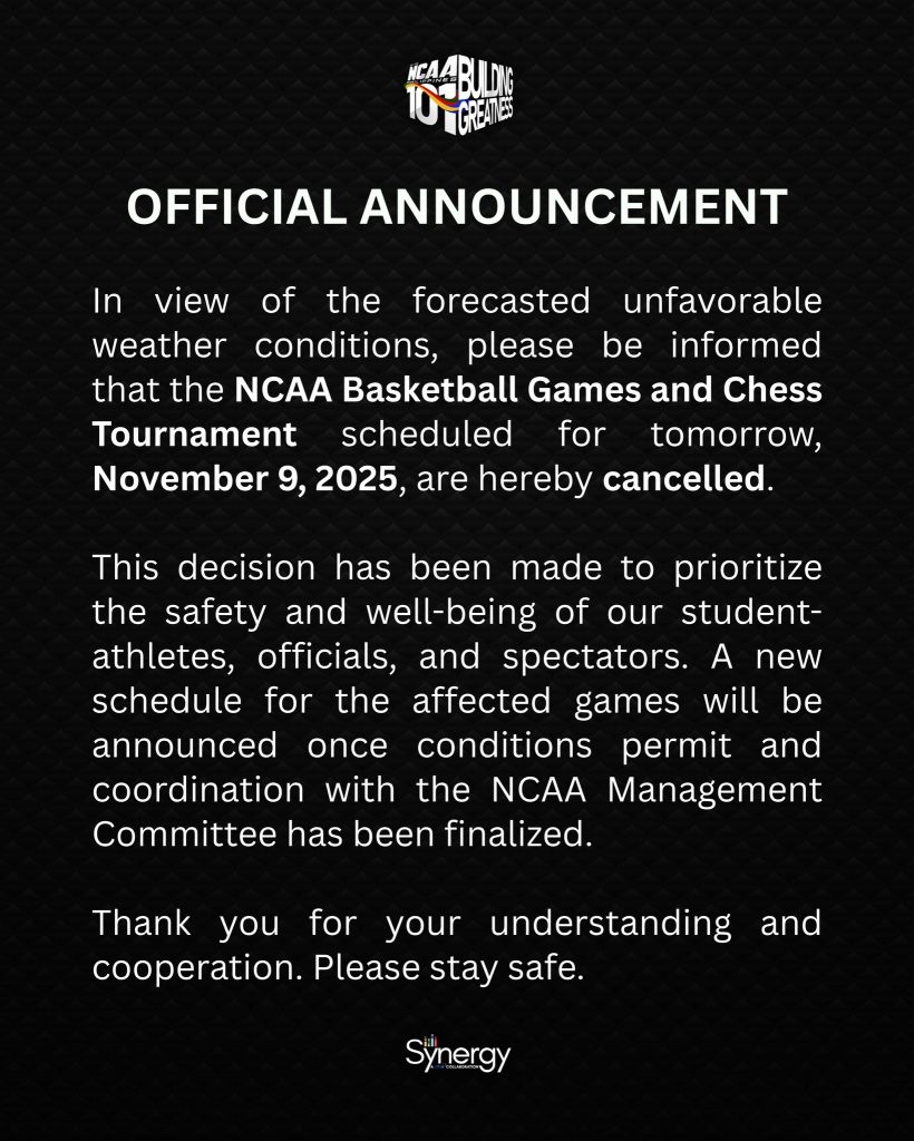 The league explained, “In view of the forecasted unfavorable weather conditions, please be informed that the NCAA Basketball Games/Chess Tournament scheduled for tomorrow, November 9, is hereby cancelled.”