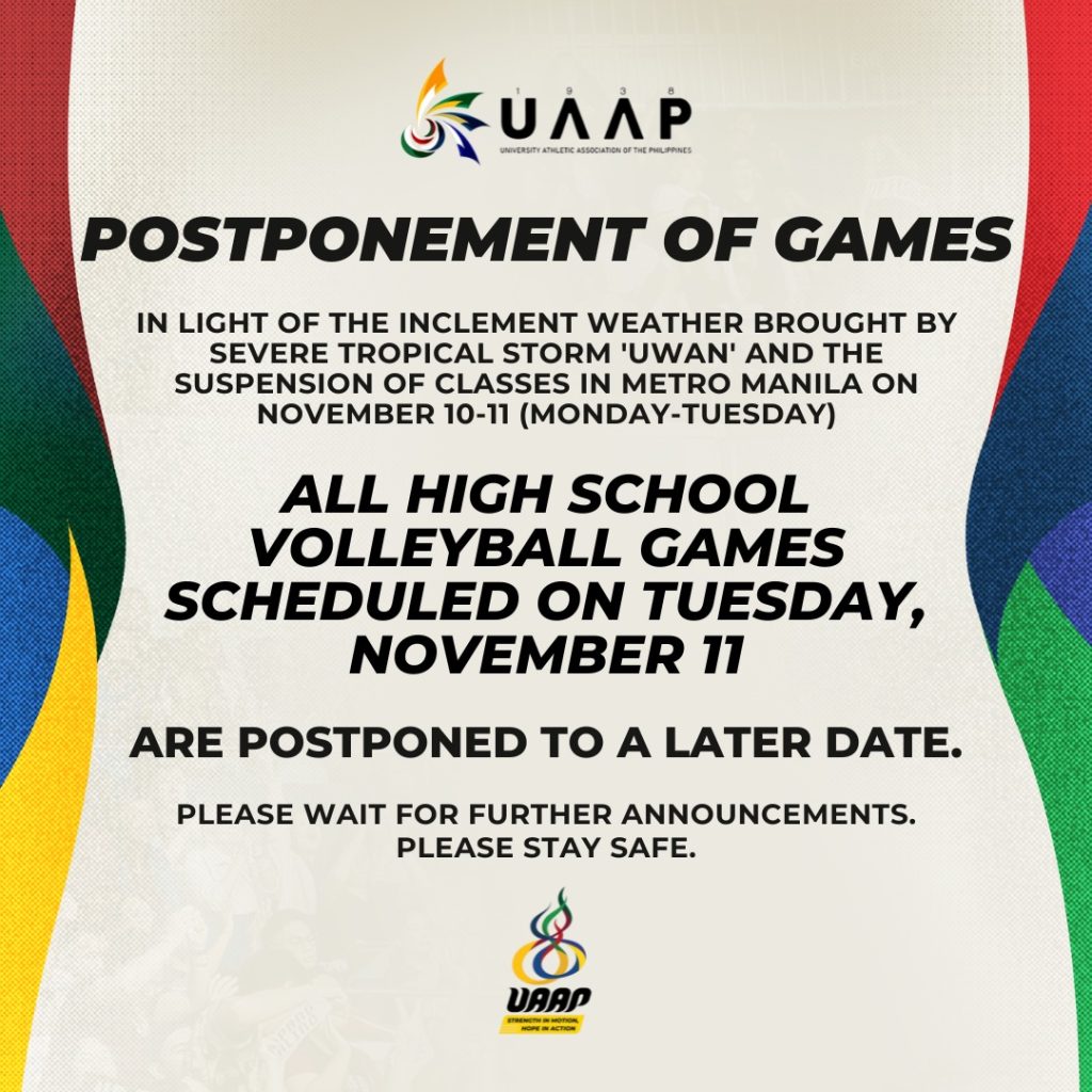 For the UAAP, school volleyball games on Tuesday will be played on a later date.