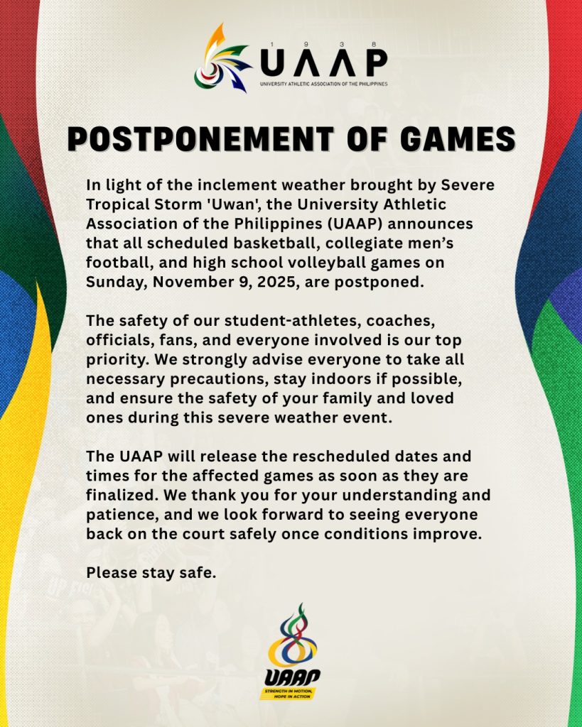 Major Philippine sports leagues such as the PBA, NCAA, and UAAP have postponed their scheduled games on November 9 and 11 due to the anticipated severe thunderstorms that Super Typhoon Uwan is expected to bring to the country.
